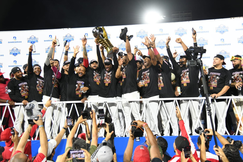 Los jugadores de los Leones del Escogido levantan el trofeo de campeón luego de blanquear 1-o a los Toros del Este.